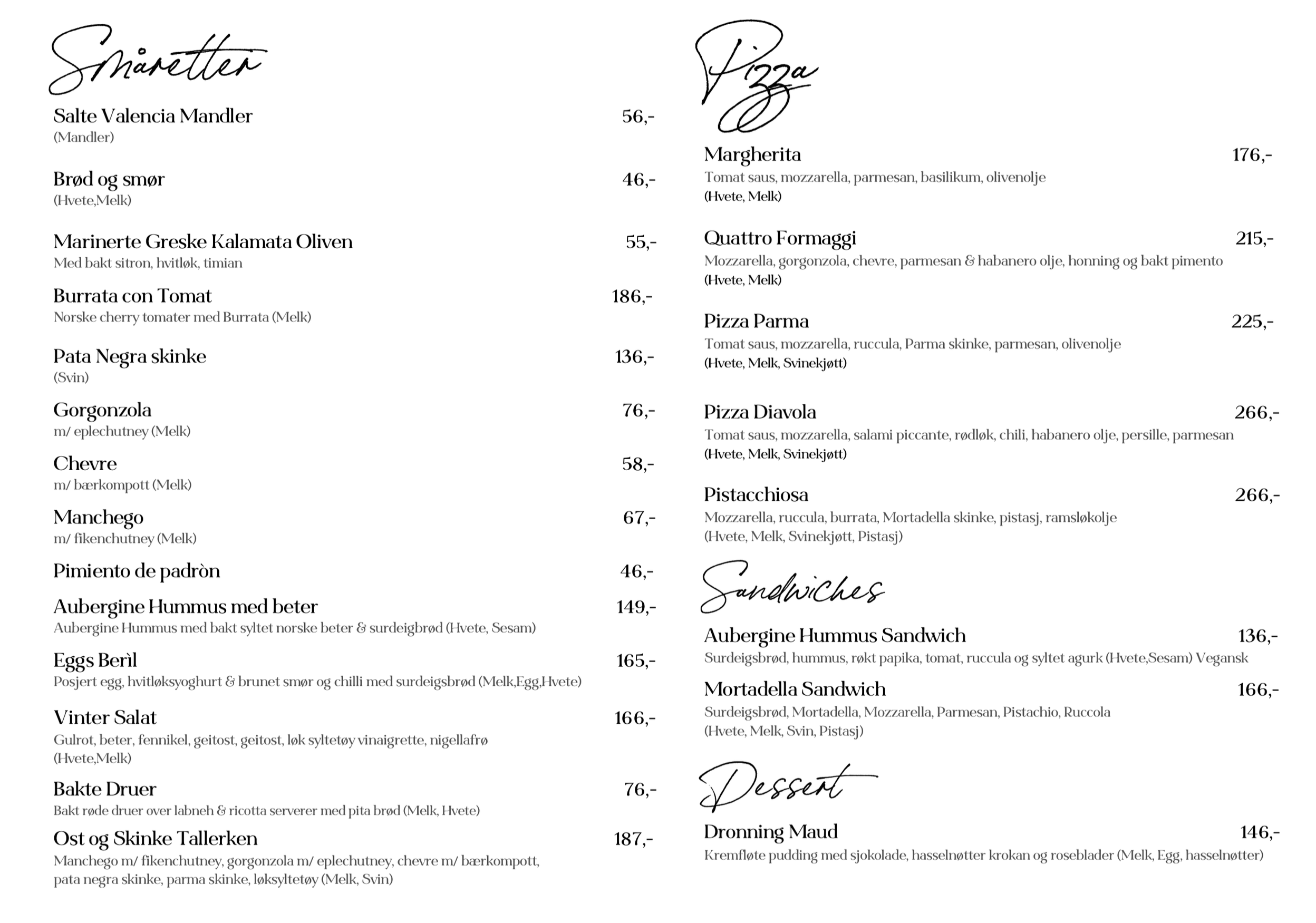 Og er du fysen på noe varmt, så har vi vår steinovnsbakte pizza – enten du går for den klassiske Margherita, den spicy Diavola, en salt Parma-variant, eller en ekte ostebombe med Quattro Formaggi.